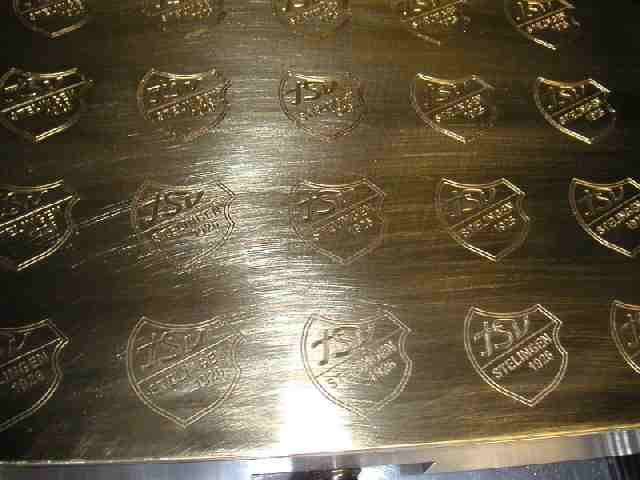 Bei größeren Stückzahlen mit dem gleichen Motiv klebe ich eine ganze Messingplatte in der auf den Maschinentisch. In der selben Aufspannung werden dann auch die Konturen ausgefräst.