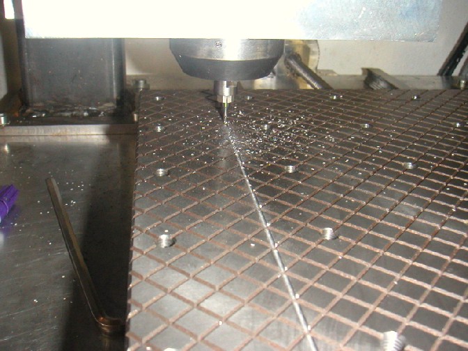 Maschinentisch Oberseite. Hier wird eine Nut gefräst in die später eine 3mm Dichtschnur gelegt werden kann zum abdichten der Vakuumkanäle.