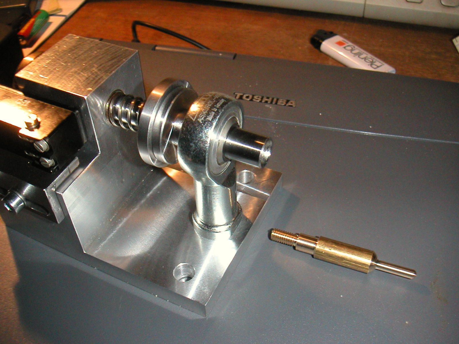 Funktion: Der Tastkopf (Messingteil rechts)tastet die Oberfläche des Teils ab. Auf den Bildern ist ein Tastkopf für einen 4 mm Kugelfräser zu sehen.